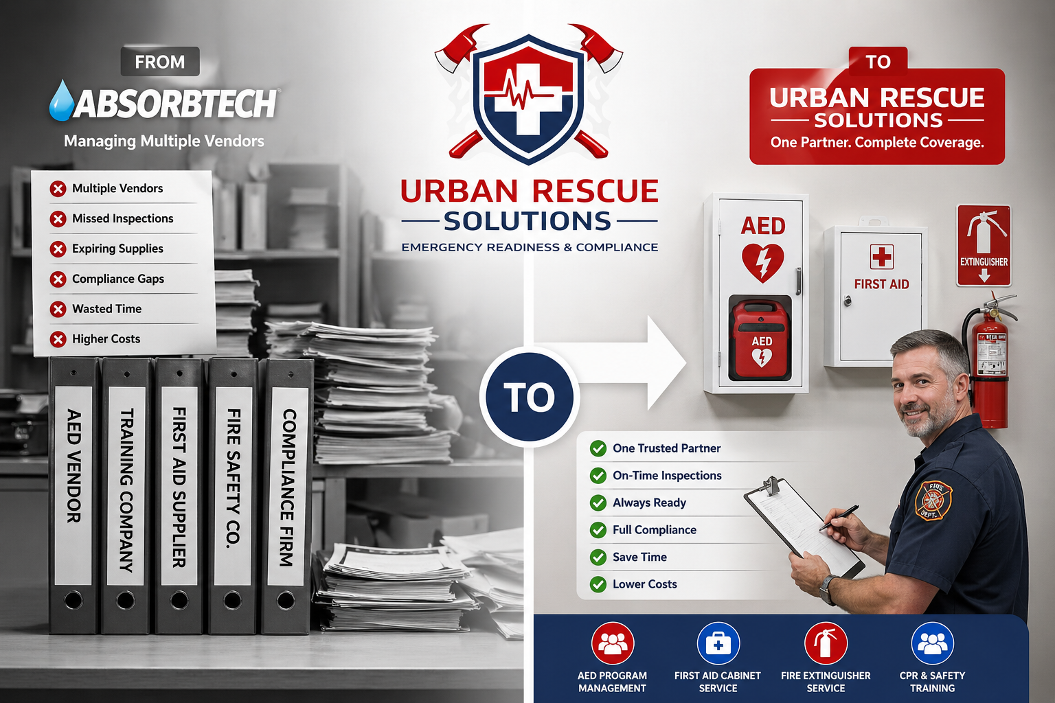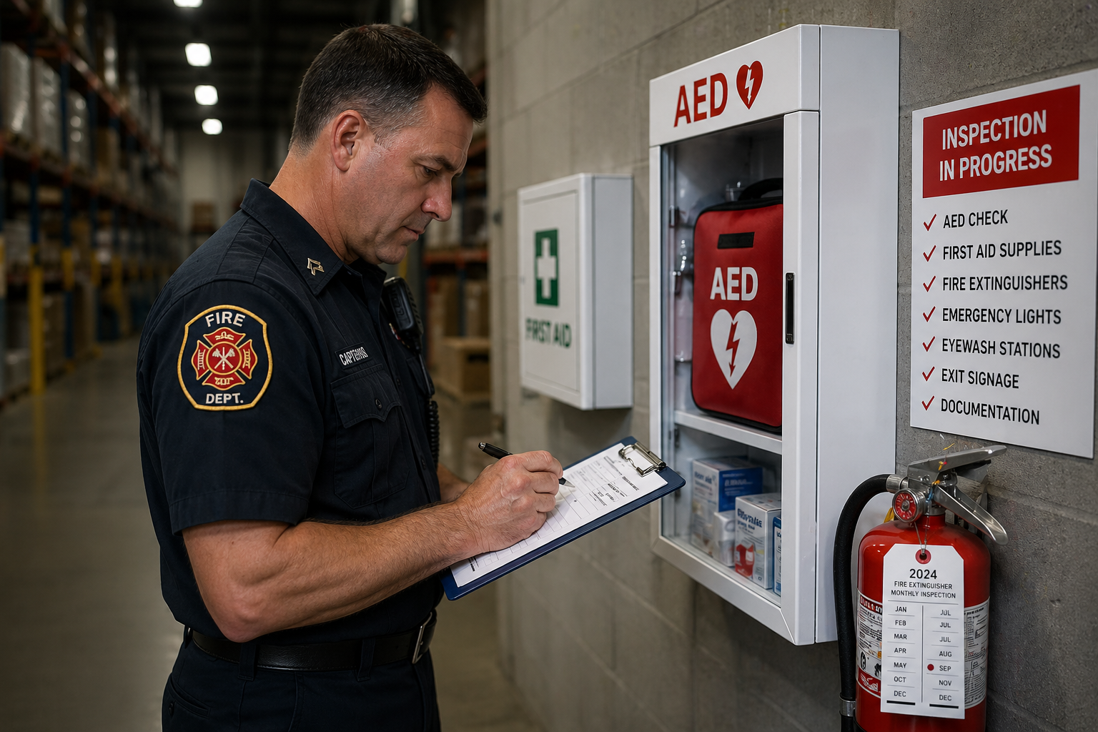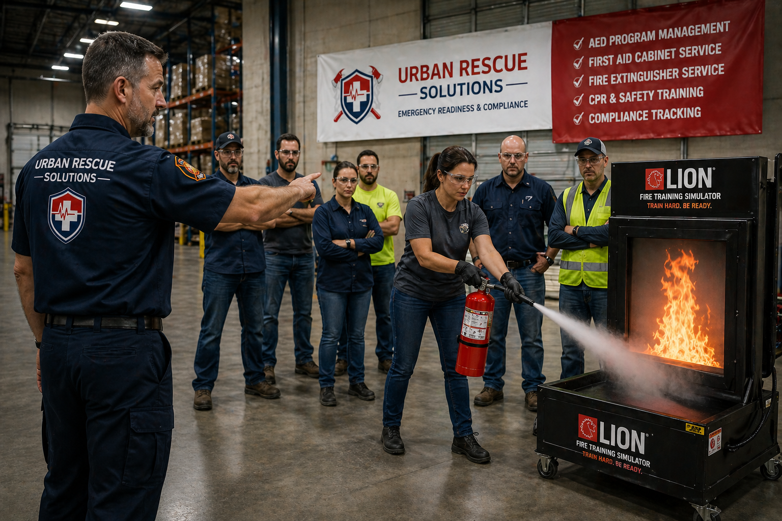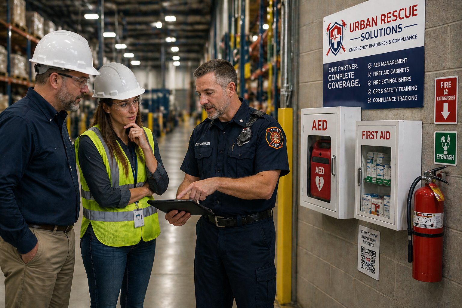 Firefighter-led AED management, CPR training, first aid cabinets, fire extinguisher service, and workplace compliance — all through one trusted partner.