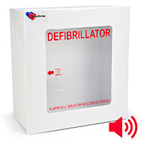 HeartStation Budget Alarm Cabinet- Compact Size, Surface Wall Mounting Box. Alarm runs on three G13A button cell batteries (included). White steal cabinet. Made in the USA.